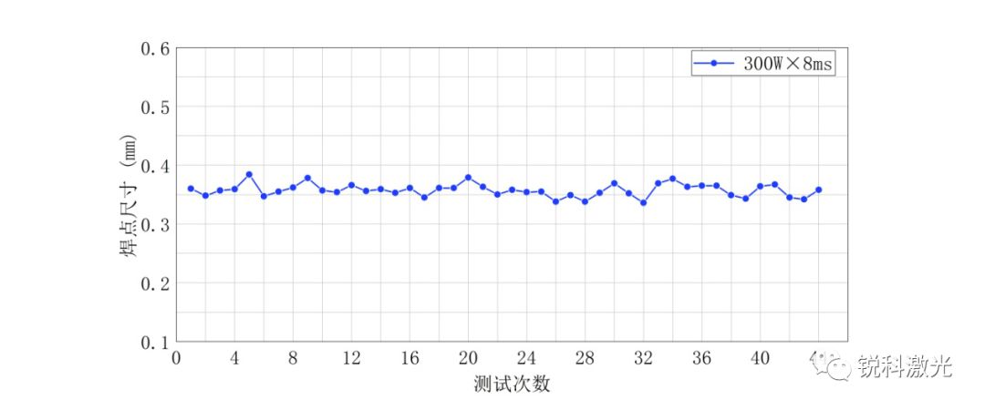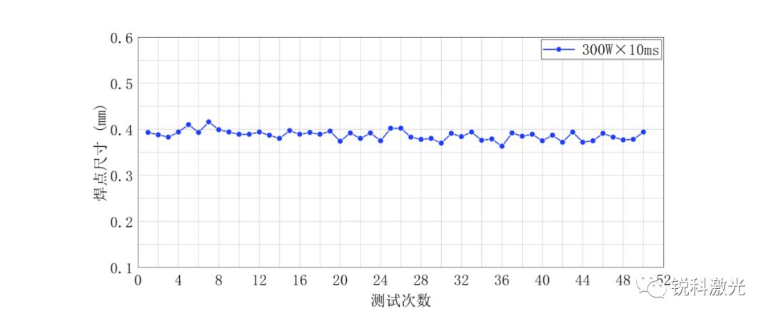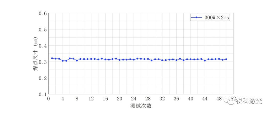 分别在2.5mm厚304不锈钢上打出50个焊点,通过测量焊点尺寸,分析焊点均匀度及激光器出光稳定性。