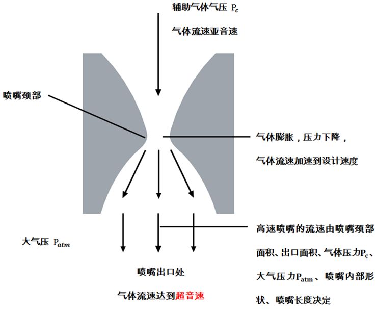 高速喷嘴的工作原理与火箭和喷气发动机的排气原理相同,对进入喷嘴的气体有加速的作用,因此高速喷嘴对于粘性材料的切割能产生更好的效果。